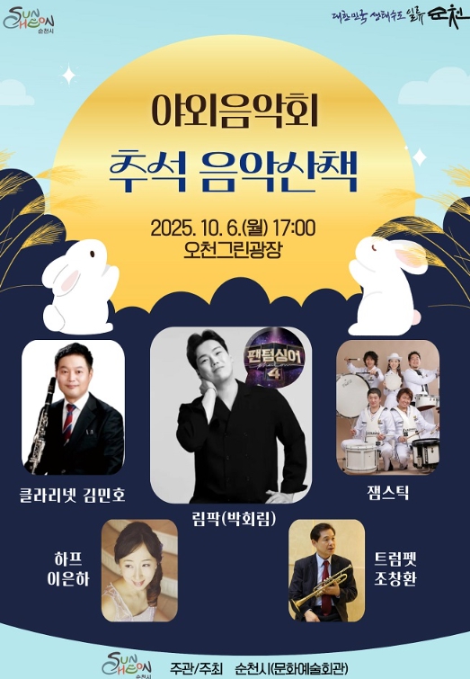 [무한뉴스=정민정 기자] 순천시 문화예술회관은 추석 명절을 맞아 시민과 관광객을 위한 야외음악회 '추석 음악산책'을 10월 6일 추석 당일 오후 5시에 오천그린광장에서 개최한다고 밝혔다.