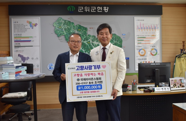 [무한뉴스=최진수 기자] 군위군은 국제라이온스협회 356-E(경북)지구 조석현 총재(제38대)가 지난 23일 군위군청을 방문하여 고향사랑기부금 100만원을 전달했다고 밝혔다.