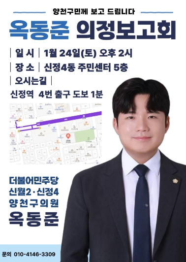 [무한뉴스=양현명 기자] 양천구의회 옥동준 의원(더불어민주당, 신정4·신월2동)이 오는 24일 오후 2시 양천구 신정4동 주민센터에서 의정보고회를 열어 그간의 의정활동 성과와 향후 계획을 양천구민께 보고하는 자리를 마련한다.