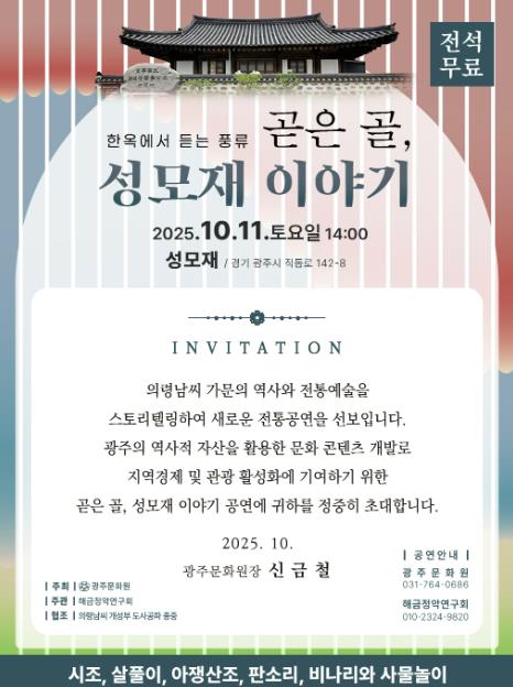 올해 하반기는 의령남씨 일가 약천 남구만을 주제로 한 “한옥에서 듣는 풍류 곧은골, 성모재 이야기” 공연으로 시민들의 곁을 찾아갈 예정이다.