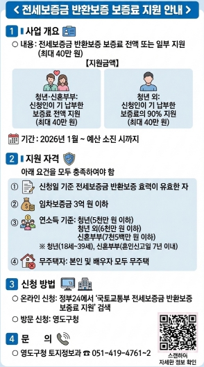 [무한뉴스=최진수 기자] 부산시 영도구는 임차인의 전세보증금 미반환 피해를 예방하고 주민들의 주거 안정을 도모하기 위해 ‘전세보증금 반환보증 보증료 지원사업’을 올해에도 지속 추진한다고 밝혔다.