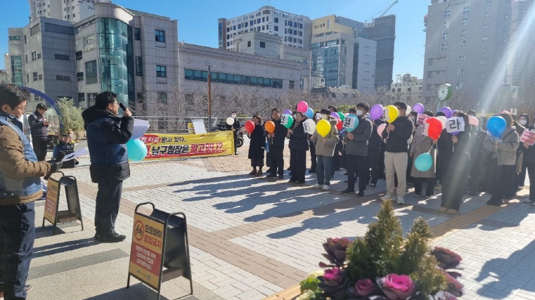 [무한뉴스=최진수 기자] 전국공무원노동조합 부산지역본부 남구지부는 오은택 남구청장의 유례없는 갑질 행정 및 인사 참사를 규탄하며, 2026년 1월 6일 12시, 중식시간을 이용하여 남구청 광장에서 남구 조합원 60여 명이 참여한 중식 선전전을 개최했습니다.