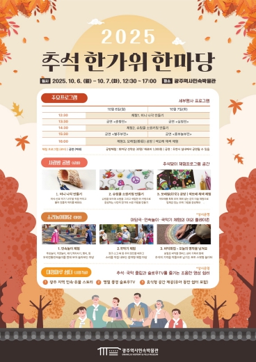 [무한뉴스=정민정 기자] 광주역사민속박물관은 추석 명절을 맞아 오는 6일부터 7일까지 이틀간 ‘2025년 추석 한가위 한마당’을 개최한다.