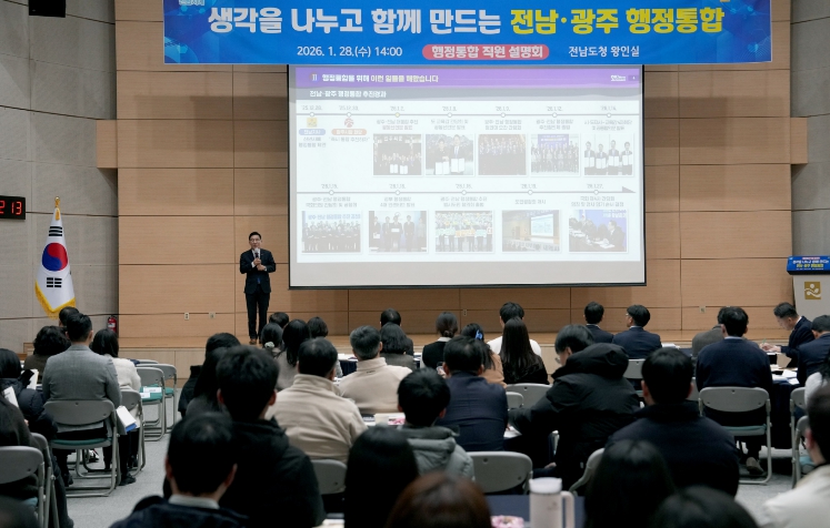 [무한뉴스=정민정 기자] 전라남도는 28일 도청 왕인실에서 직원들을 대상으로 ‘전남·광주 행정통합 직원설명회’를 열고, 추진 경과와 주요 쟁점을 공유하며 직원 의견을 청취했다.