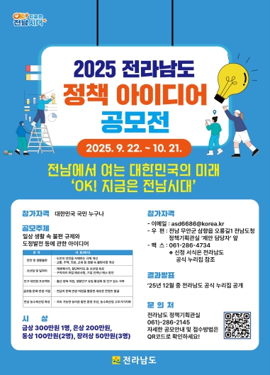 [무한뉴스=정민정 기자] 전라남도가 새 정부의 실용주의 기조에 맞춰 ‘생활 속 불편을 찾고 이를 개선할, 지역의 미래를 먹여 살릴 정책’을 주제로 ‘2025년 전라남도 정책 아이디어 공모전’을 개최한다.