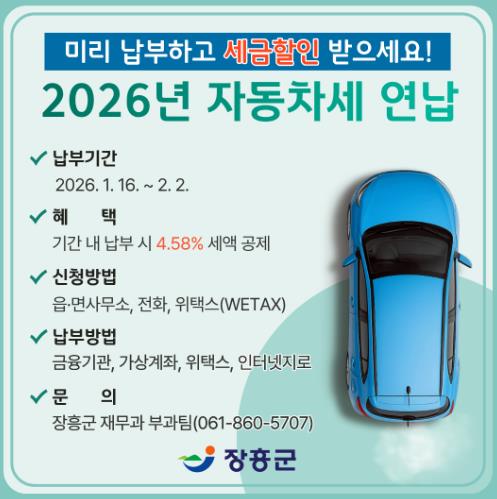 | ▲ 장흥군 “2026년 자동차세 연납하고 공제받으세요” |