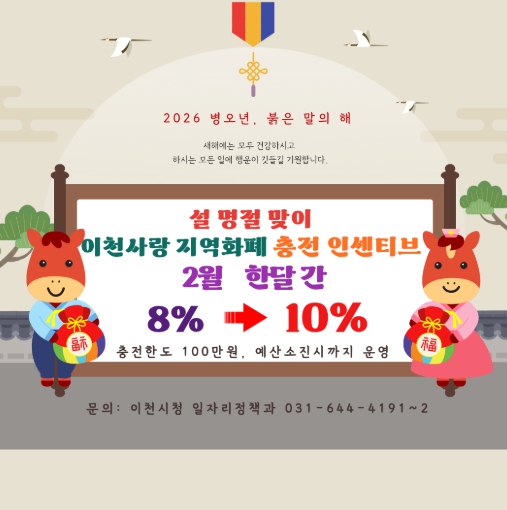 [무한뉴스=정충근 기자] 이천시는 설 명절을 맞아 지역경제 활성화와 소상공인 매출 증대를 위해 2026년 2월 한 달간 이천사랑지역화폐 충전 인센티브를 기존 8%에서 10%로 상향한다고 밝혔다.