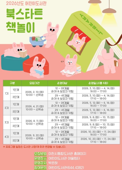 [무한뉴스=정충근 기자] 이천시 어린이도서관이 2026년 영유아와 양육자를 위한 ‘북스타트 책놀이’ 프로그램을 운영한다.