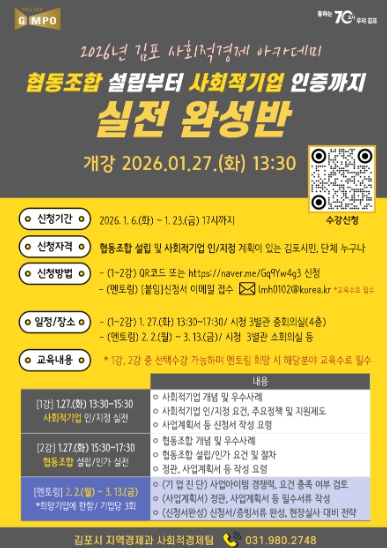 [무한뉴스=정승훈 기자] 김포시가 사회문제 해결을 위한 참신한 아이디어와 실행력을 갖춘 사회적경제기업 육성을 위해 '2026년 김포시 사회적경제 아카데미'를 개설하고, 오는 1월 23일까지 수강생을 모집한다.