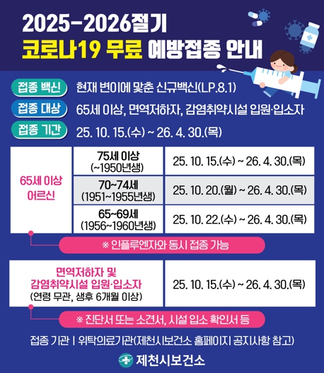 [무한뉴스=정민정 기자] 제천시는 오는 15일부터 65세 이상 어르신, 생후 6개월 이상 면역저하자, 감염취약시설 입원․입소자를 대상으로 신규 코로나 백신(LP.8.1)을 활용해 코로나19 무료 예방접종을 실시한다.