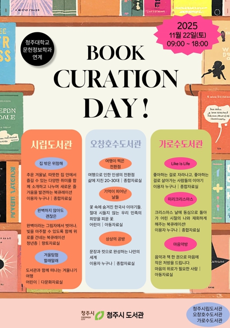 [무한뉴스=정민정 기자] 청주시립도서관은 청주대학교 문헌정보학과(지도교수 김혜영)와 함께 오는 22일 오전 9시부터 오후 6시까지 △시립도서관 △오창호수도서관 △가로수도서관 등 3개 도서관에서 ‘북큐레이션 데이’를 동시에 개최한다고 밝혔다.