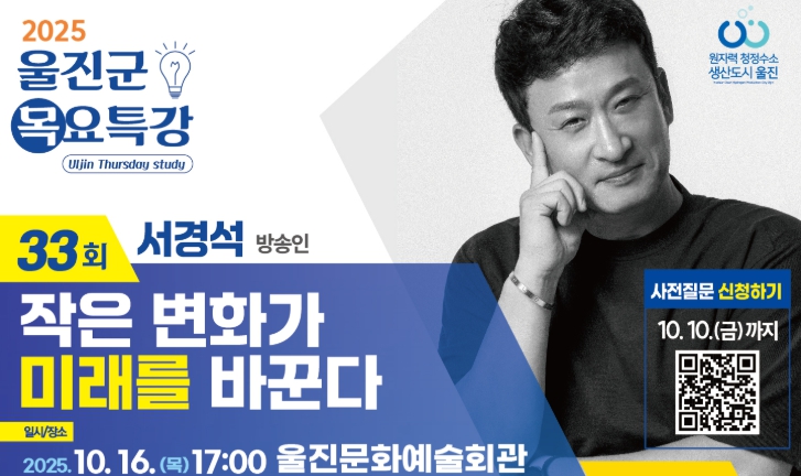 [무한뉴스=최진수 기자] 울진군은 오는 10월 16일 오후 5시 후포면 울진문화예술회관에서 제33회 울진군 목요특강을 개최한다.