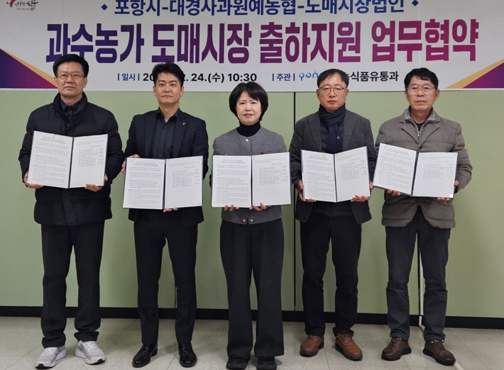 [무한뉴스=최진수 기자] 포항시는 24일 포항시 농산물 도매시장에서 2026년 신규사업인 ‘과수농가 도매시장 출하지원사업’의 원활한 추진을 위한 업무협약(MOU)을 체결했다.