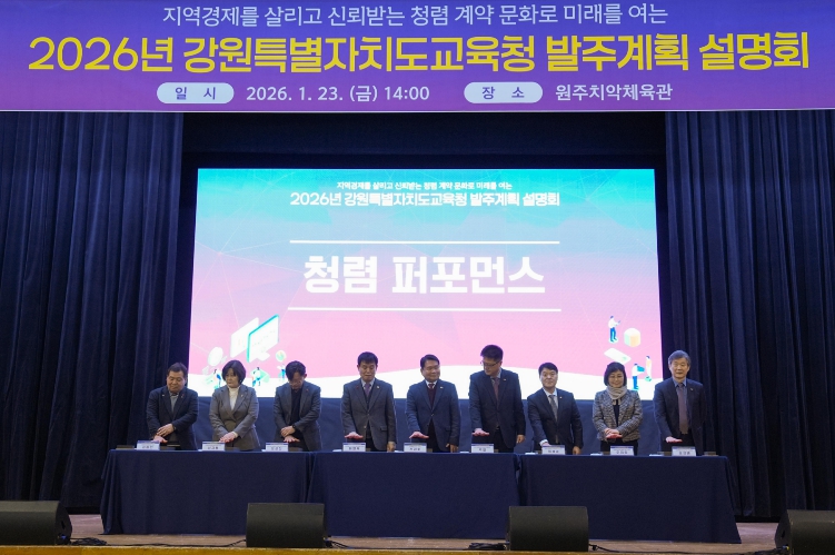 [무한뉴스=정민정 기자] 강원특별자치도교육청은 23일 원주 치악체육관에서 청렴한 계약문화 확산과 지역경제 상생을 위한 ‘2026년 공사·용역·물품 발주계획 설명회’를 개최했다.