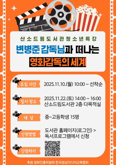 이번 특강은 오는 11월 22일 오후 2시부터 4시까지 산소드림도서관에서 열리며, 단편영화 관람 후 변병준 영화감독이 직접 참여해 영화감독으로서의 생생한 현장 이야기와 제작 과정을 들려줄 예정이다.