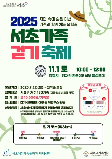[무한뉴스=정승훈 기자] 서울 서초구는 서초여성가족플라자 방배센터, 서초구 가족센터와 함께 11월 1일 서울의 대표적인 생태하천인 양재천에서 ‘2025 서초가족 걷기 축제’를 개최한다고 밝혔다.