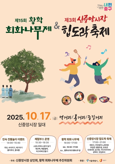 [무한뉴스=정승훈 기자] 서울 중구 황학동의 오랜 전통을 품은‘황학회화나무제’와 젊은 감각이 살아 있는‘신중앙시장 힙도락(HIP:道樂) 축제’가 오는 17일 오후 2시에 함께 열린다. 두 축제는 2023년부터 연계 개최해, 황학동의 가을을 더욱 풍성히 채우고 있다.