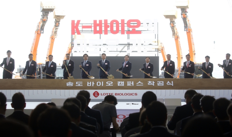 | ▲ 2024년 7월 3일 롯데바이오로직스 착공식. 롯데바이오로직스는 송도에 조성되는 바이오캠퍼스 1공장 건립 목적으로 2023~2024년 5,500만 달러 투자에 이어 올해 2,870만 달러 투자를 결정했다 |