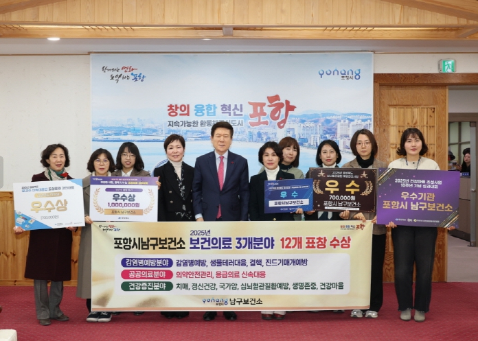 [무한뉴스=최진수 기자] 포항시 남구보건소가 2025년 한 해 동안 보건의료 전 분야에서 탁월한 성과를 거두며, 중앙부처와 경상북도 평가 등에서 총 3개 분야 12개의 상을 휩쓸었다고 23일 밝혔다.