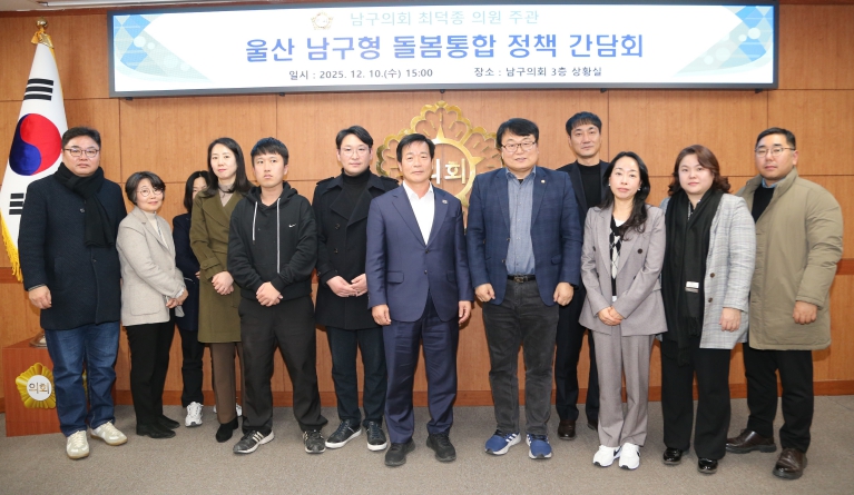 [무한뉴스=양현명 기자] 울산 남구의회 최덕종 의원(더불어민주당, 신정4동·옥동)은 10일 3층 의회상황실에서 보건의료, 노인, 장애인 등 다양한 분야의 실무자들과 함께 남구형 돌봄통합 정책 간담회를 개최했다.
