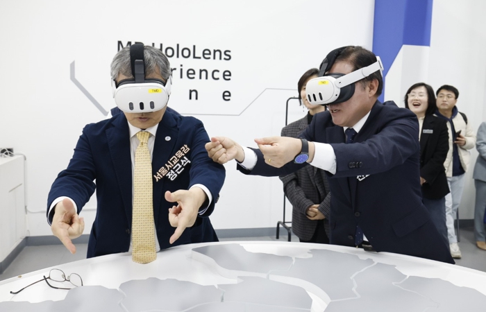 | ▲ 진교훈 서울 강서구청장(오른쪽)이 1일 정근식 서울시교육감과 함께 마곡광장에 위치한 4차산업 혁신기술 체험센터 ‘서울퓨처랩’에서 가상공간에서 건물 등을 자유자재로 배치해보는 ‘MR(혼합현실) 홀로렌즈’를 체험하고 있다. |
