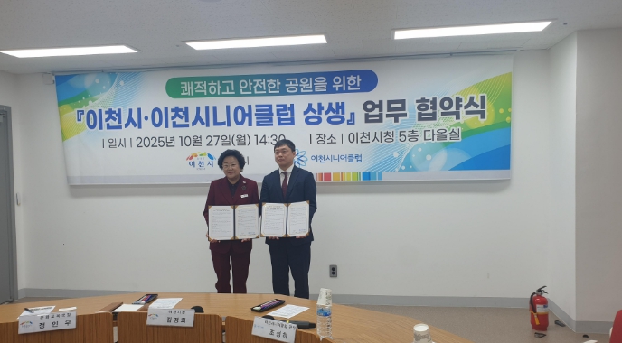 [무한뉴스=정충근 기자] 이천시는 10월 27일 이천시니어클럽과 ‘쾌적하고 안전한 공원을 위한 상생 업무협약(MOU)’을 체결했다. 이번 협약은 공원 환경정화와 안전관리 강화를 위해 민관이 협력체계를 구축하고, 어르신의 사회참여와 일자리 확대를 지원하기 위해 추진됐다.