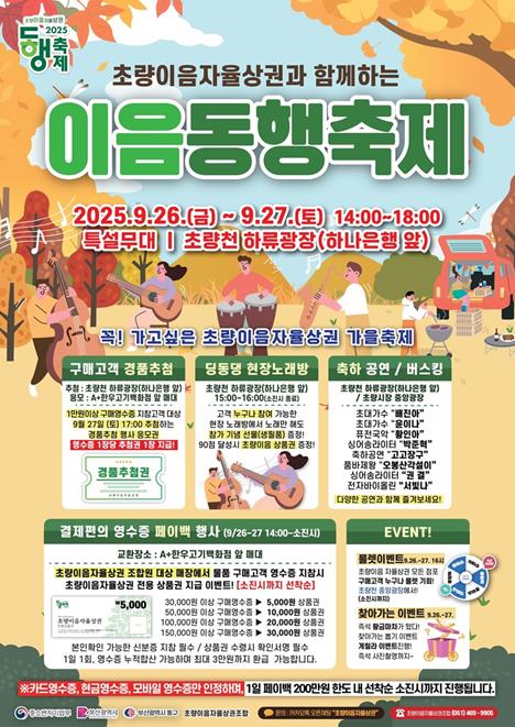 [무한뉴스=최진수 기자] 부산 초량이음자율상권조합은 9월 전국 동행축제 기간에 맞춰 오는 9월 26일 부터 27일 양일간 초량이음자율상권 구역 내에서 “이음동행축제”를 연다고 밝혔다.