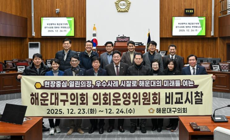 [무한뉴스=최진수 기자] 해운대구의회 의회운영위원회는 지난 12월 23일부터 24일까지 1박 2일간의 일정으로 경주시 일원을 방문해 선진 의회 시설을 비교·분석하고 의정 역량 강화를 위한 벤치마킹을 실시했다.