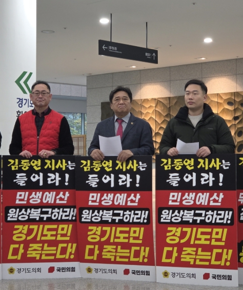 [무한뉴스=양현명 기자] 경기도의회 교육기획위원회 김호겸 의원(국민의힘, 수원5)은 2025년 12월 3일 백현종 경기도의회 국민의힘 대표의원을 중심으로 경기도의회 교육기획위원회 위원 및 교육행정위원회 위원들과 함께 김동연 지사가 팽개치고 있는 경기도 민생예산 복구를 촉구했다.