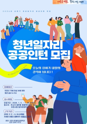 [무한뉴스=정충근 기자] 이천시는 2026년 1월 5일부터 1월 16일까지 ‘청년일자리 공공인턴사업’의 상반기 참여자 47명을 모집한다.