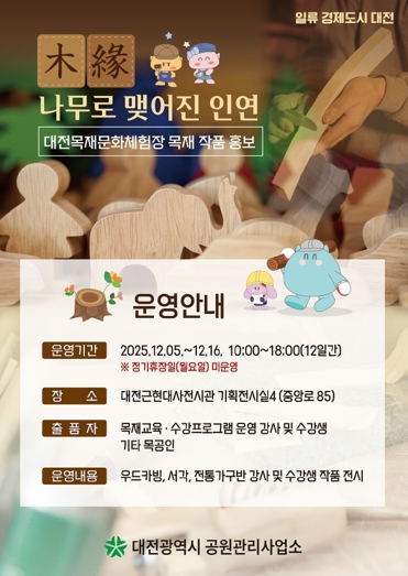 [무한뉴스=정민정 기자] 대전시는 공원관리사업소(목재문화체험장) 주관으로 12월 5일부터 16일까지 대전근현대전시관 기획전시실에서 목재교육·수강 프로그램에 참여한 강사와 수강생들의 작품 80여 점을 특별전시한다.