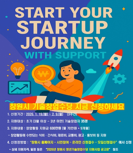 [무한뉴스=최진수 기자] 창원특례시는 1월 19일부터 2월 9일까지 ‘2026년 청년기술창업수당 지원사업’ 참여자 35명을 모집한다고 밝혔다.