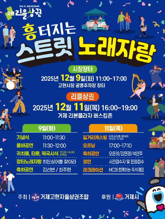 오는 12월 9일과 11일, 고현시장 공영주차장 장터와 리을상권 리본플라자 버스킹존에서 특별 연말행사 ‘흥터지는 스트릿 노래자랑’이 개최된다.