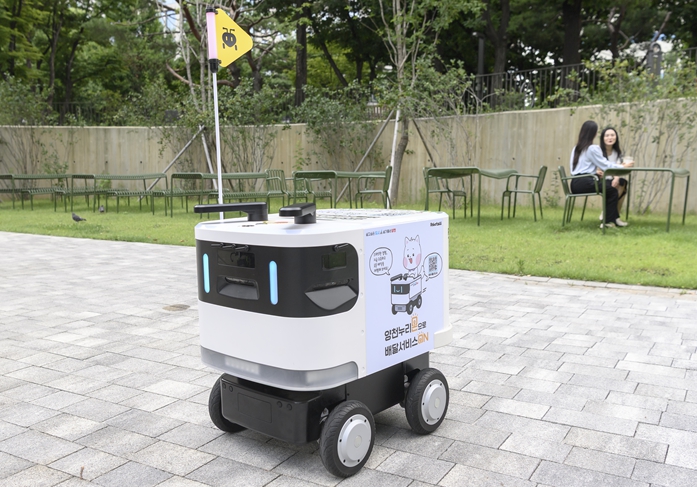 | ▲ 양천구 내 공원에서 배달중인 실외 자율주행로봇 '개미'(로보티즈) |