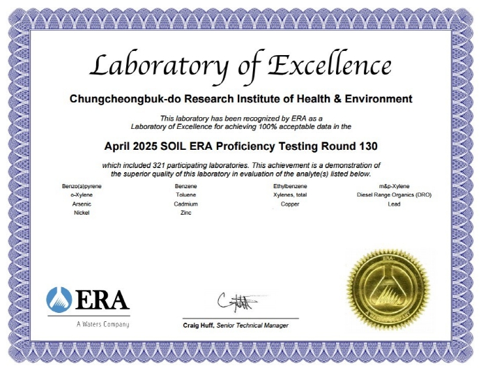 [무한뉴스=정민정 기자] 충북보건환경연구원(원장 임헌표)이 2025년에 실시한 수질·먹는물·토양 등 8개 환경분야 측정분석 숙련도 평가에서 모두 ‘만족(Satisfactory)’ 평가를 받아 분석능력이 탁월함을 다시 한번 국내외로부터 공식 인정 받았다고 밝혔다.
