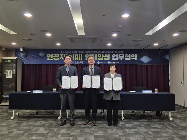 [무한뉴스=정민정 기자] 제주국제자유도시개발센터는 12월 11일 제주대학교, 제주상공회의소와 함께 도내 인공지능(AI) 전문인재 양성을 위한 업무협약을 체결했다.