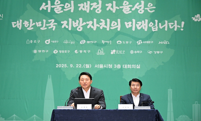 [무한뉴스=정승훈 기자] 서울시와 구청장협의회는 22일 오전 8시 30분 서울시청 대회의실에서 소비쿠폰 등 정책 비용에 대한 정부의 일방적인 지자체 전가와 서울시에 대한 차등적 국비 보조 관행 개선을 촉구하는 내용의 ‘서울시‧자치구 지방재정 공동선언’을 발표했다.