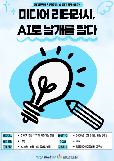 [무한뉴스=정승훈 기자] (재)김포문화재단과 경기콘텐츠진흥원은 오는 10월 30일과 31일, 양일간 김포미디어아트센터 교육실에서 '미디어리터러시, AI로 날개를 달다' 디지털 리터러시 및 AI 활용 교육을 공동 개최한다고 밝혔다.