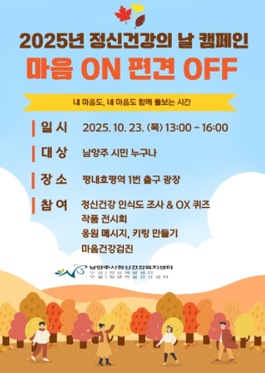 [무한뉴스=정승훈 기자] 남양주시는 오는 23일 오후 1시 평내호평역 1번 출구 광장 일원에서 ‘정신건강의 날’을 기념해 정신건강 인식 개선 및 편견 해소를 위한 연합캠페인 ‘마음 ON, 편견 OFF’를 진행한다고 21일 밝혔다.