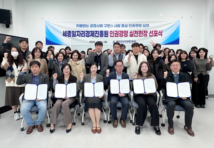[무한뉴스=정민정 기자] 세종일자리경제진흥원(원장 이홍준)은 21일 본원 2층 교육실에서 ‘인권경영 실천헌장 선포식’을 열고 모든 임직원이 인권을 경영의 핵심 가치로 삼아 실천해 나갈 것을 다짐했다.