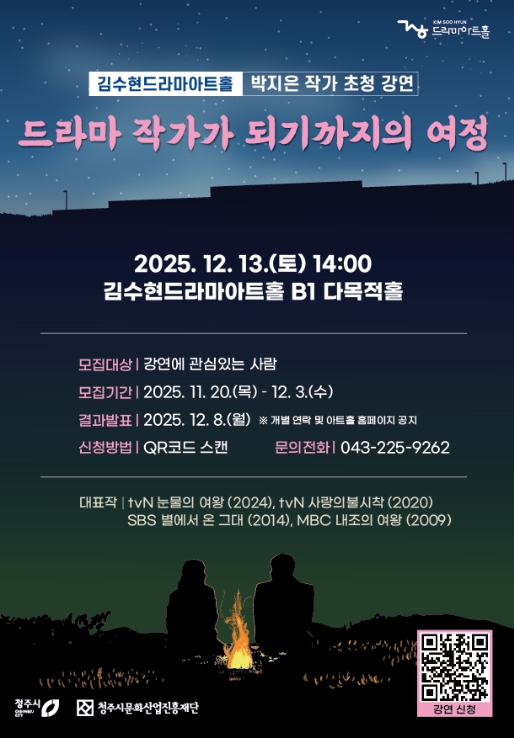 청주시문화산업진흥재단이 운영하는 국내 유일 드라마문학관 김수현드라마아트홀(이하 드라마아트홀)은 다음달 3일 오후 4시까지 ‘박지은 작가 초청 강연’ 참여자를 모집한다.