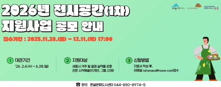 [무한뉴스=정민정 기자] 세종시문화관광재단 한글문화도시센터는 11월 28일부터 12월 11일까지 지역 시각예술*인의 창작활동을 지원하기 위해 ‘2026년 전시공간 지원사업(1차)’ 공모를 진행한다.