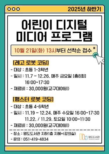 [무한뉴스=최진수 기자] 영도도서관에서 어린이복합문화공간의 디지털 교육환경을 기반으로 관내 어린이들의 디지털 역량 강화와 창의력 향상을 위한 ‘2025년 하반기 어린이 디지털 미디어 프로그램’을 운영한다.