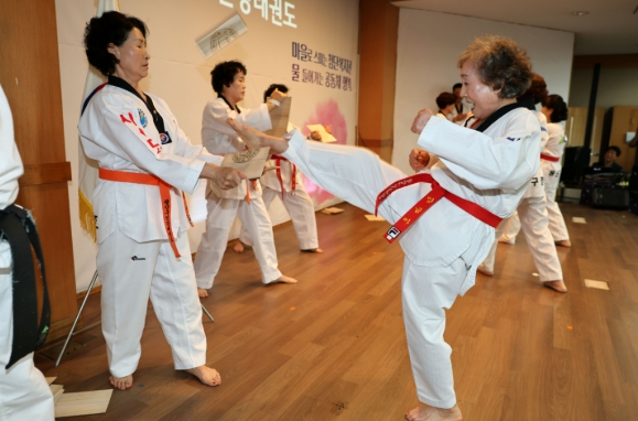 | ▲ 23일 첨단종합사회복지관에서 열린 문화예술제에서 태권도 회원들이 역량을 뽐내고 있다. |