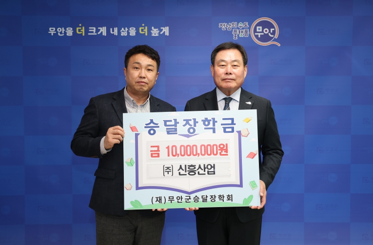 [무한뉴스=정민정 기자] 전남 무안군은 지난 1일 지역인재 육성을 위해 ㈜신흥산업이 장학금 1천만 원을, 청솔수산 윤낙진 대표가 장학금 1백만 원을 각각 (재)무안군승달장학회에 기탁했다고 밝혔다.