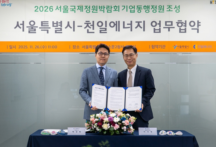 [무한뉴스=정승훈 기자] 서울시는 2026년 서울숲에서 개최되는 서울국제정원박람회 내에 기업동행정원 조성을 위해 ESG 경영에 힘쓰고 있는 천일에너지와 11월 26일 업무협약을 체결했다.
