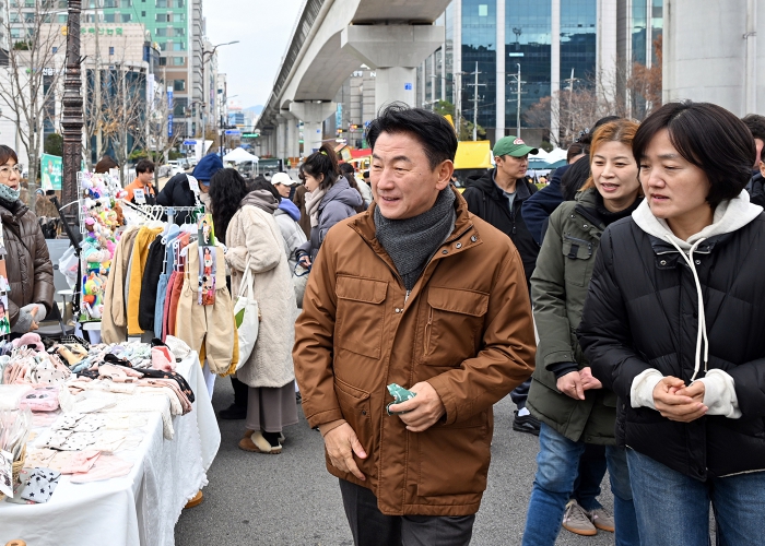 | ▲ 김동근 시장이 11월 29일 시청 앞 도로 일원에서 열린 ‘걷기 좋은 거리’ 행사 현장을 둘러보고 있다. |