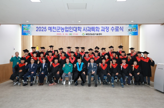 [무한뉴스=최진수 기자] 예천군은 30일, 농업인대학생 40여 명이 참석한 가운데 ‘예천군농업인대학 사과 특화과정 수료식’을 개최했다. 이 자리에는 김학동 군수와 강영구 군의회 의장, 도기욱 경북도의원 등 주요 인사들도 참여해 수료자들을 축하했다.