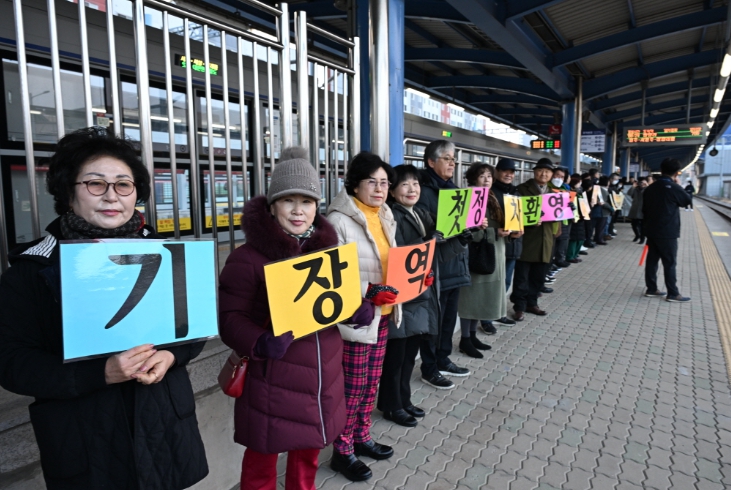 주민들은 기장역 승강장에 모여 환영피켓을 들고, 출발하는 KTX-이음 열차를 향해 손을 흔들며 첫 정차의 기쁨을 함께 나눴다.