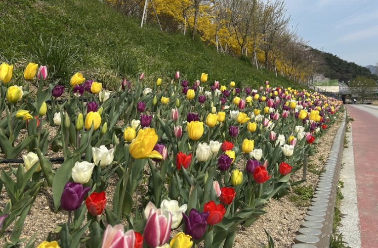 군은 좌광천 평전교, 용상교, 구연교 주변 사면 등 평소 주민들이 자주 산책하는 곳에 튤립 2만 5천 본을 심어, 주민들이 일상속에서 아름답고 화려한 튤립을 감상할 수 있게 했다.